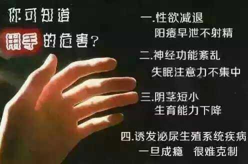 健康提示,手淫过度会导致枢神经系统和全身症状如意志消沉,记忆力减退,注意力不集中,理解力下降,失眠,多梦,头昏,心悸等。还有可能导致泌尿生殖系疾病慢性前列腺炎引起尿频,尿末滴白,下腹及会阴部不适,腰酸无力,性欲减退,阳痿,不射精等。