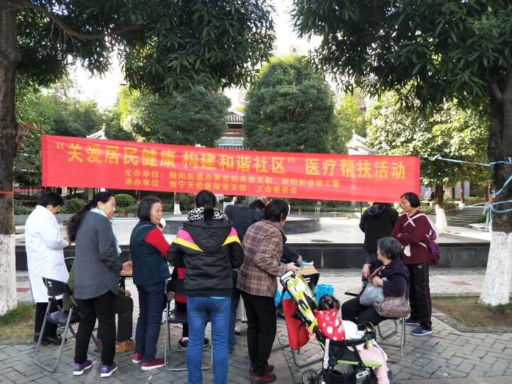 为了提高新阳街道办辖区居民的健康水平和自我保健、自我防护意识,新阳街道办党支部与南宁曙光医院,联合开展了“关爱居民健康、构建和谐社区”医疗帮扶活动,缓解社区群众“看病远、看病贵、看病难”等问题,为辖区居民提供一个便捷的预防疾病和保健平台;让我们把这份爱心义诊一直延续下去。